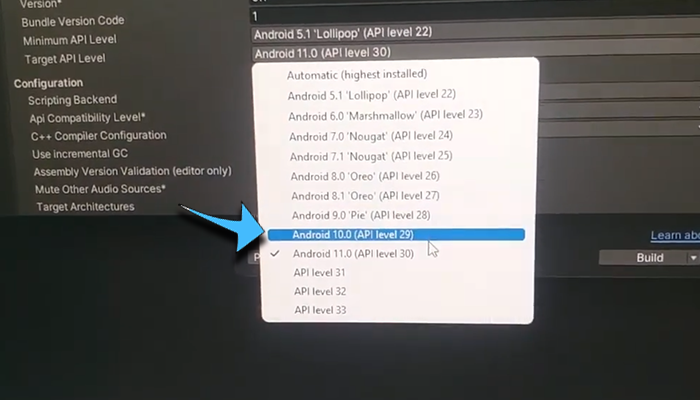 Answer: If you are publishing to Play Store, Google requires a specific minimum API level (usually the latest major release). So for Play Store, select the required API level—but ensure your Unity version supports it. Otherwise, update Unity.